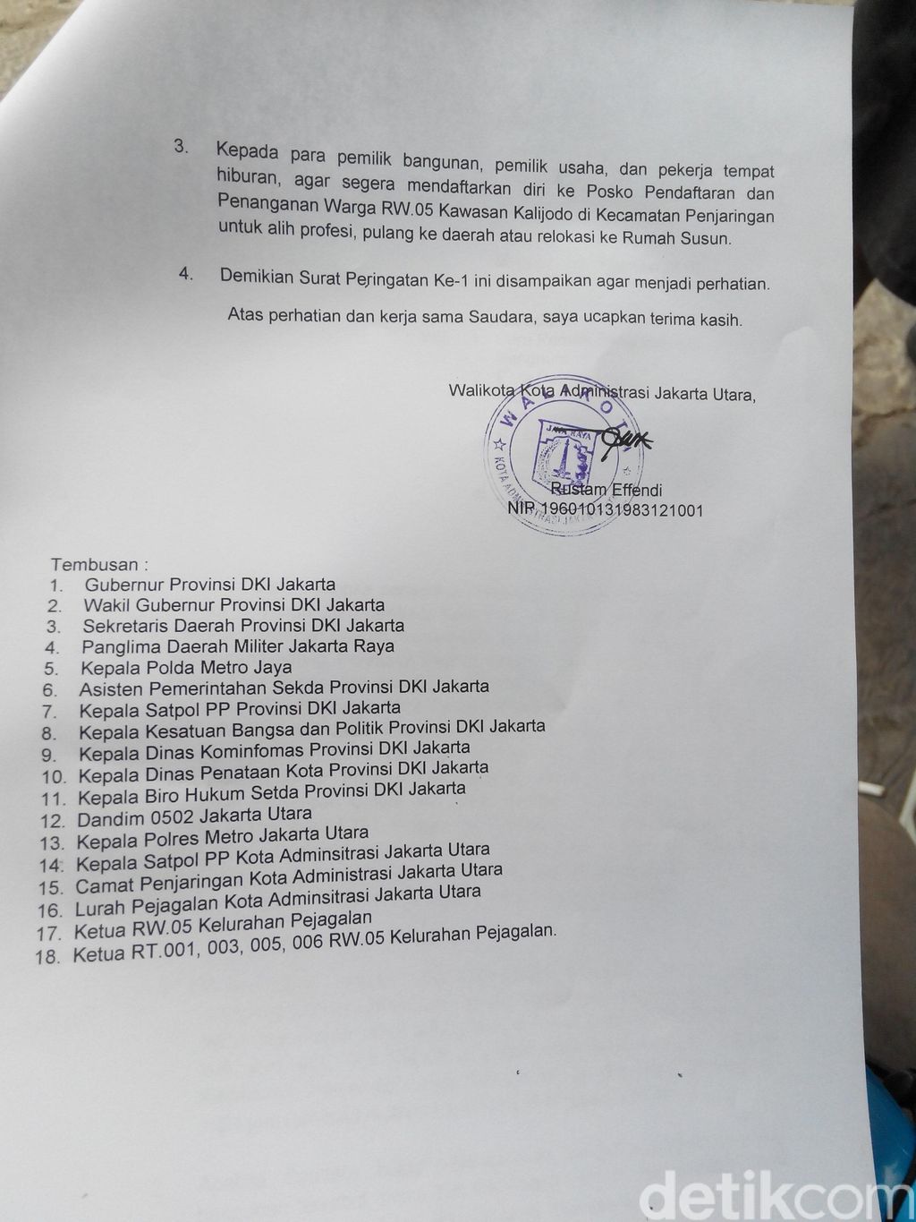 SP1 ini ditandatangani Rustam Effendi dengan tembusan Gubernur DKI Basuki Tjahaja Purnama (Ahok) dan 17 pejabat lainnya.