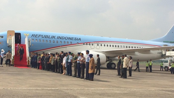 Pesawat Kepresidenan yang membawa Jokowi mendarat di Bandara Halim Perdanakusuma sekitar pukul 09.30 WIB, Jumat (19/2/2016). Jokowi yang tampil mengenakan jas, tampak turun dari pesawat didampingi Ibu Negara Iriana Widodo.