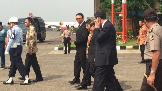 Begitu turun, Jokowi disambut Wapres Jusuf Kalla dan istrinya Mufidah Kalla. Hadir juga Menko Kemaritiman Rizal Ramli, Menkeu Bambang Brodjonegoro, Menko Polhukam Luhut Pandjaitan, Seskab Pramono Anung, Menko Perekonomian Darmin Nasution, Sekretaris Negara Pratikno.