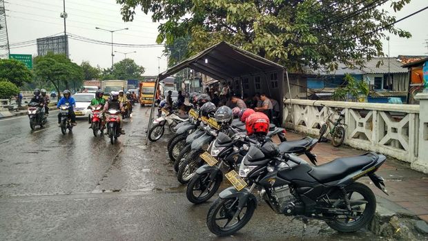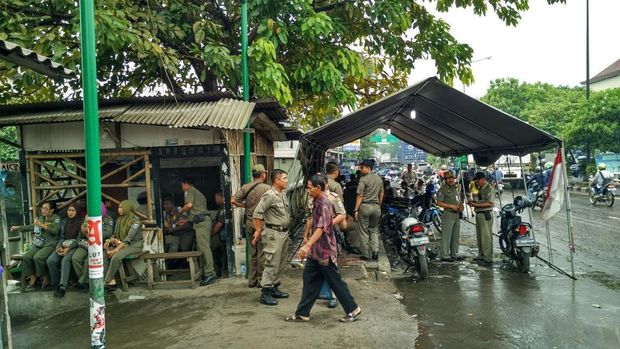 Di Kalijodo terlihat beberapa Satpol PP dan petugas kepolisian berjaga. Mereka memasang tenda di depan jalan masuk ke Kalijodo.