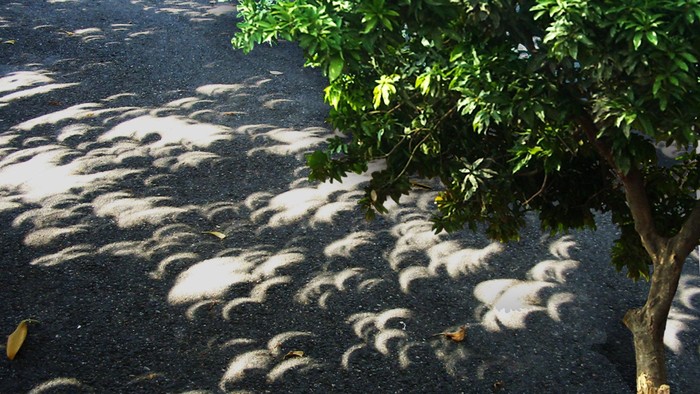 Bayangan matahari itu berasal dari sinar matahari yang menembus dedaunan. Daun-daun pohon berfungsi sebagai kisi, seolah ada ratusan bahkan ribuan kamera lubang jarum yang digantung di atas pohon.