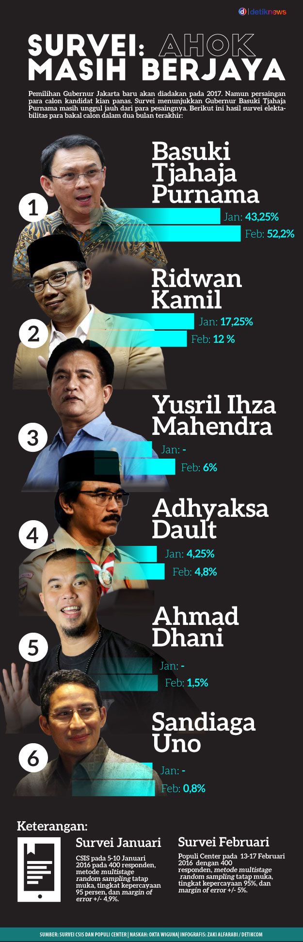 Namun elektabilitas Ahmad Dhani ini masih sedikit di atas Sandiaga Uno, berikut tingkat elektabilitas 8 tokoh yang digadang akan mengikuti Pilgub DKI 2017 versi Populi Center: