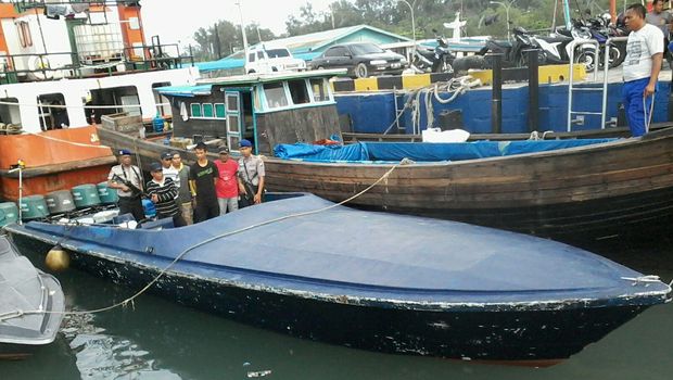 Speed boat Riski One sepanjang 12 meter diamankan di perairan Kabupaten Lingga oleh kapal patroli Direktorat Polair Polda Kepri, Selasa (23/2/2016). Nakhoda speed boat sempat berusaha kabur, tapi berhasil ditangkap. Berdasarkan pemeriksaan, ada 12 ton biji timah di kapal yang diawaki 5 orang tersebut.