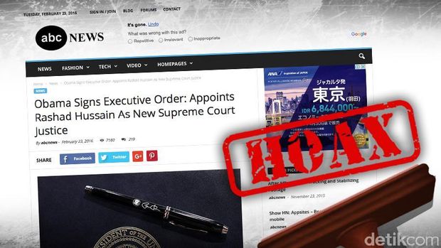 Berita tersebut dimuat situs abcnews.com.co, Selasa (23/2/2016) dan spontan dibagikan para netizen di media sosial. Dalam artikel disebutkan Obama menunjuk Hussain sebagai hakim agung dalam Keputusan Presiden 14651.