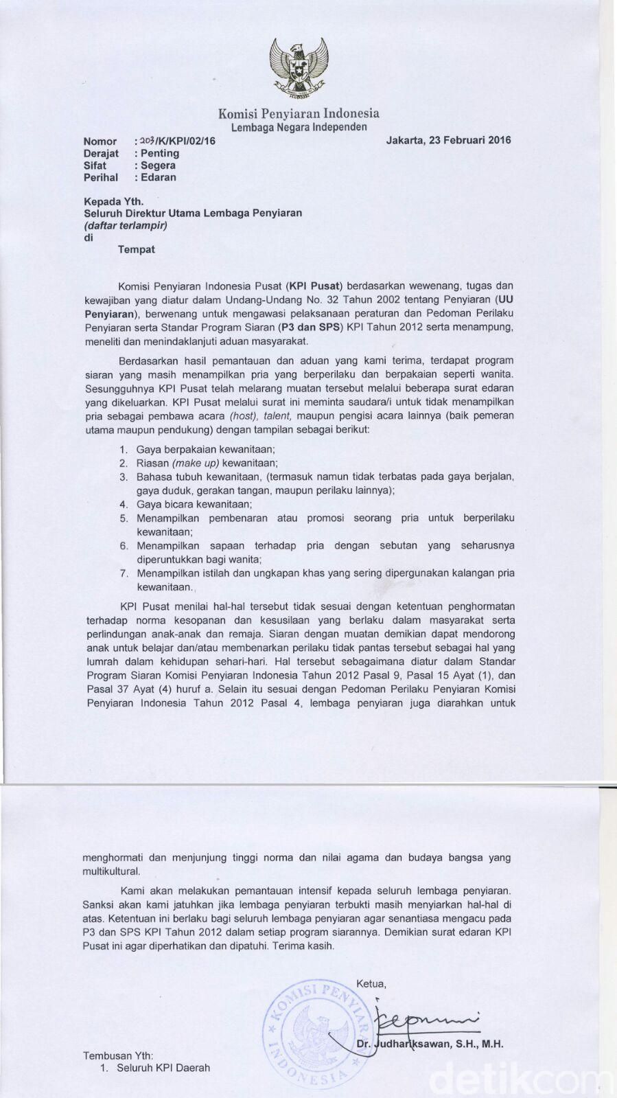 KPI melalui surat edarannya meminta lembaga penyiaran tidak menampilkan pria sebagai pembawa acara (host), talent, maupun pengisi acara lainnya, baik pemeran utama maupun pendukung dengan tampilan sebagai berikut: