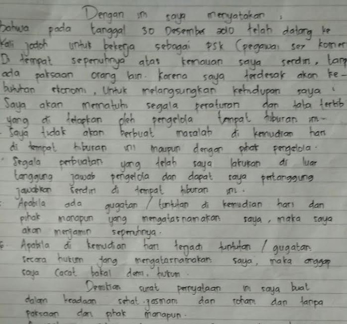 "Dengan ini saya menyatakan bahwa pada tanggal 30 Desember 2010 telah datang ke Kalijodo untuk bekerja sebagai PSK (pekerja seks komersial). Di tempat sepenuhnya atas kemauan saya sendiri, tanpa ada paksaan orang lain, karena saya terdesak akan kebutuhan ekonomi, untuk melangsungkan kehidupan saya," demikian tulisan salah satu PSK pada lembaran pernyataan tersebut.