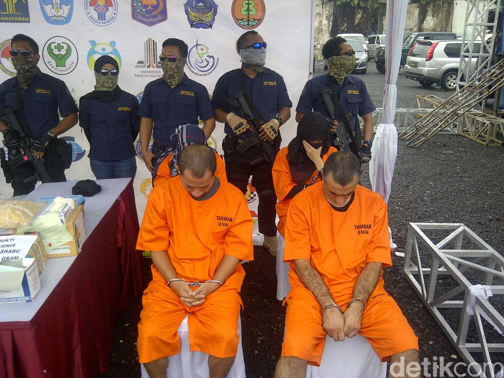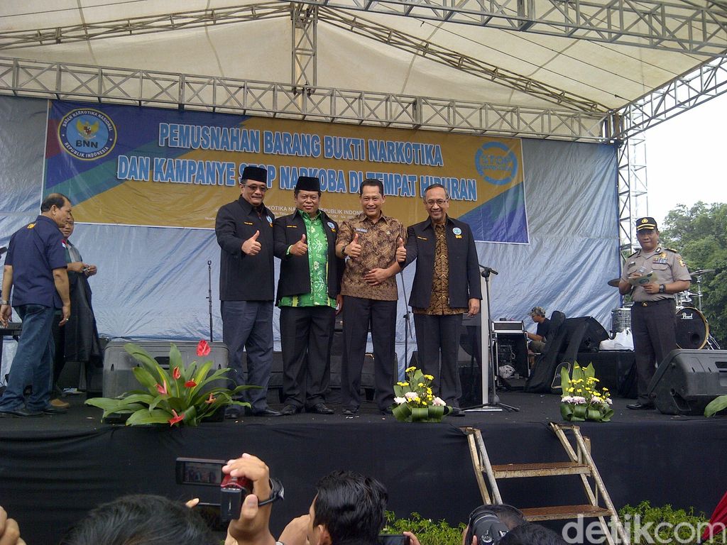 Acara berlangsung di lapangan parkir di Jl Cengkeh, Kota Tua, Jakarta Barat, Jumat (26/2/2016). Selain Buwas dan Djarot, hadir juga Direktur Reserse Narkoba Polda Metro Jaya Kombes Eko Daryanto. 4 Tersangka dari Pakistan yang mengenakan baju tahanan BNN warna oranye juga dihadirkan pada acara pemusnahan ini.