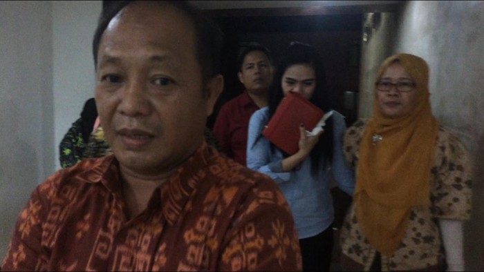 Rianti (kemeja biru) yang diduga menganiaya bocah Marvel saat berada di Polda Metro Jaya, Jumat (26/2/2016). Foto: Mei Amelia/detikcom