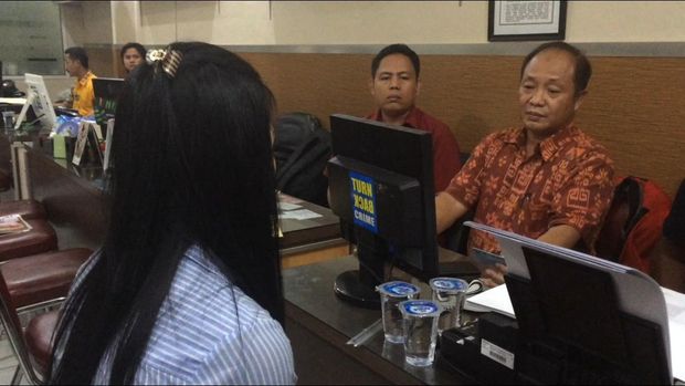 Rianti (kemeja biru) yang diduga menganiaya bocah Marvel saat berada di Polda Metro Jaya, Jumat (26/2/2016). Foto: Mei Amelia/detikcom |