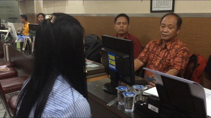 Rianti (kemeja biru) yang diduga menganiaya bocah Marvel saat dibawa ke Polda Metro Jaya, Jumat (26/2/2016). Foto: Amelia/detikcom