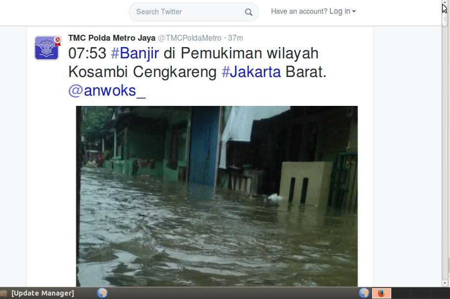 Berbagai informasi dari warga sebagaimana dicuitkan di akun Twitter TMC Polda Metro Jaya diwarnai oleh kabar banjir di Jakarta dan sekitarnya pada Minggu (28/2/2016) pagi ini. Warga me-mention akun Twitter TMC Polda Metro Jaya.