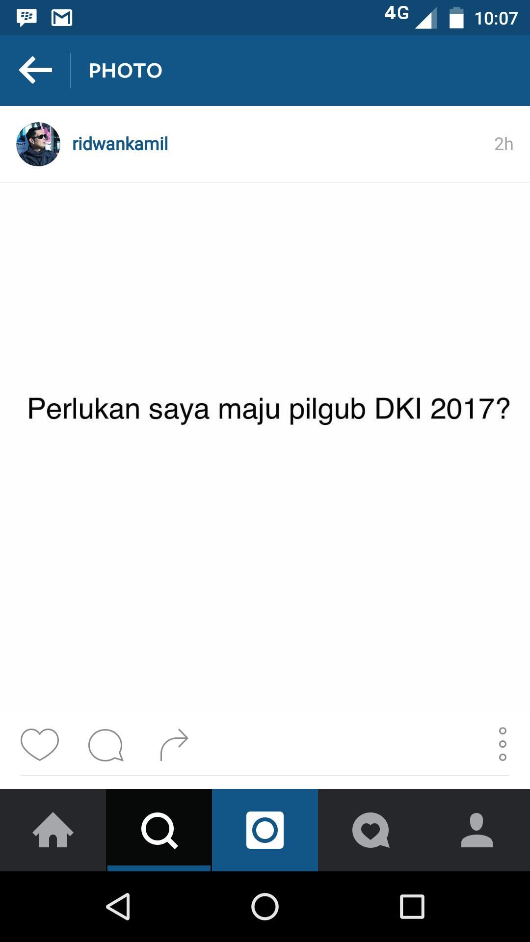 "Perlukah saya maju pilgub DKI 2017?" tulis pria yang karib disapa Emil itu dalam akun instagramnya ridwankamil, Minggu (28/2/2016).