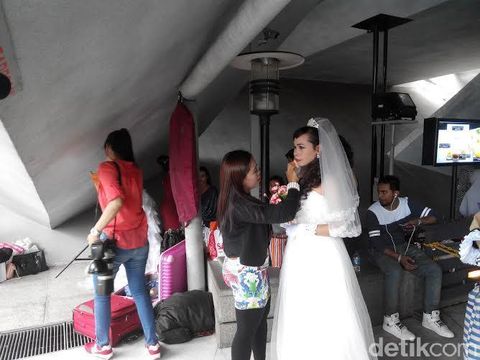 Aksi itu mengundang perhatian pengunjung sekitar patung.Β "Ini sengaja foto pre wed. Ya kami sengaja milih hari Minggu karena sekalian liburan," ujar pengantin wanita Siti Rohani.