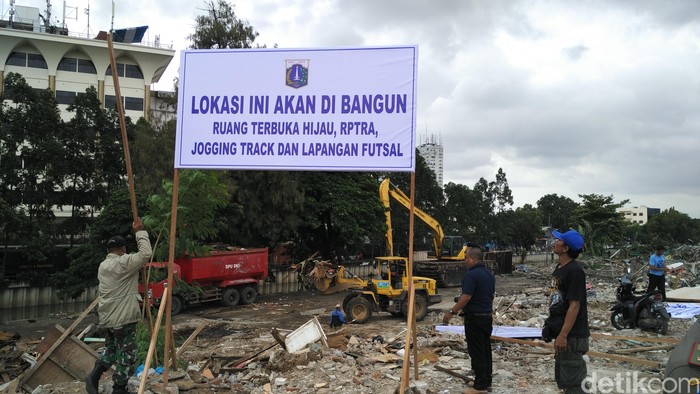 Petugas juga mendirikan papan pengumuman bertuliskan 'lokasi ini akan dibangun ruang terbuka hijau, RPTRA, jogging track dan lapangan futsal'. Rencana ini memang sudah pernah dikatakan oleh Walikota Jakarta Utara Rustam Effendi menjelang pembongkaran.