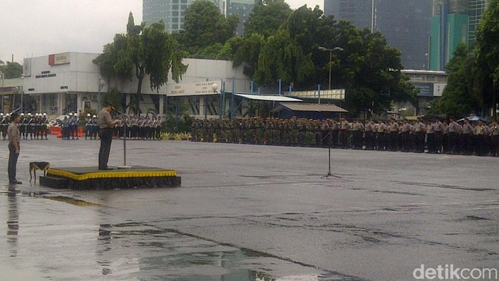 Pantauan detikcom, apel dilakukan di Mapolda Metro Jaya, Jalan Jenderal Sudirman, Jakarta Selatan Selasa (1/3/2015) sekitar pukul 07.00 WIB. Apel tetap berlanjut meski hujan lebat mengguyur.