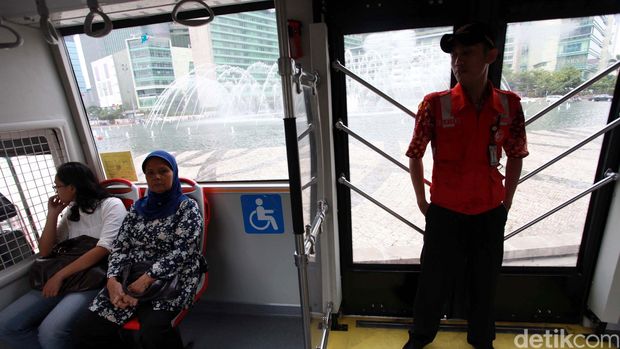 Suasana di dalam bus TransJ (Agung Pambudhy/detikFoto) |