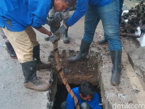 Tampak bungkus kabel yang diselimuti lumpur itu sudah diangkat dari selokan. Petugas pun masih akan terus bekerja hingga nanti sore.