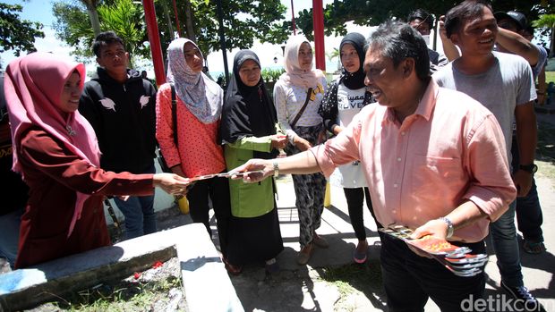 Gubernur Kepulauan Bangka Belitung Rustam Effendi membagi-bagikan kacamata gerhana di kawasan Pantai Tanjung Pendam, Belitung. Rustam mengatakan, ia menyiapkan 10 ribu kacamata gerhana yang dibeli memakai uangnya sendiri.