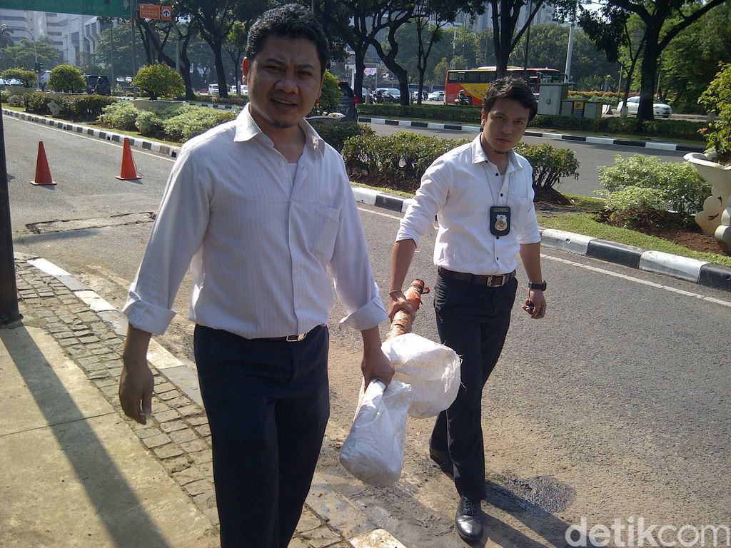2 Penyidik yang mengenakan kemeja putih dan celana hitam ini akan membawa kabel tersebut ke Polda Metro Jaya untuk kepentingan penyelidikan.
