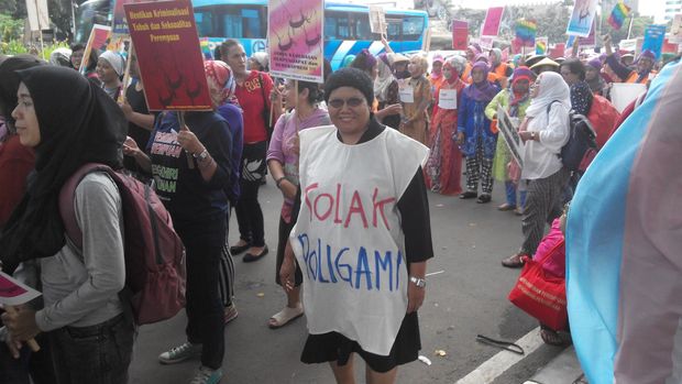 Mereka pun melakukan beragam cara untuk ekpresikan tuntutannya. Salah satunya dengan membawa spanduk bertuliskan 'stop kekerasan terhadap wanita, ada juga wanita yang memakai karung goni dengan bertuliskan stop poligami.