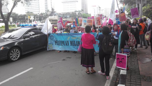 Jakarta - Ratusan wanita melakukan longmarch ke Istana Presiden di Jalan Medan Merdeka Utara, Jakarta Pusat. Para wanita itu menuntut perlindungan kesetaraan hak asasi perempuan.