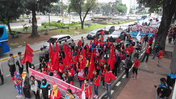 Pantauan di lapangan masa berjumlah ratusan orang berkumpul di Patung Kuda, Jalan Medan Merdeka Barat, Selasa (8/3/2016) siang. Aksi dilanjutkan dengan melakukan longmarch ke Istana Presiden. Masa yang terdiri dari GEMPA (Gerakan Perempuan Melawan Ketimpangan) dan SGBN (Sentral Gerakan Buruh Nasional) melakukan orasi.