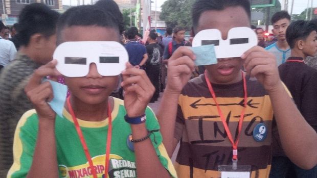 Warga Medan menyaksikan gerhana matahari memakai kacamata gerhana. |