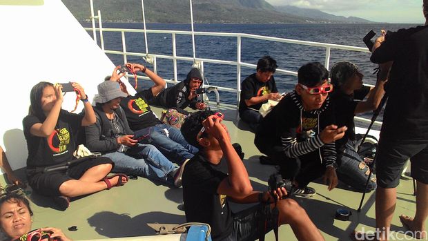 Gerhana matahari total, Rabu (9/3/2016) dinikmati Laskar Gerhana di atas kapal KN Kuda Laut dan KN Gajah Laut milik Bakamla. Para laskar berada di dek paling atas menunggu momen gerhana bersama Ibu Clara Yono Yatini dari LAPAN timnya.