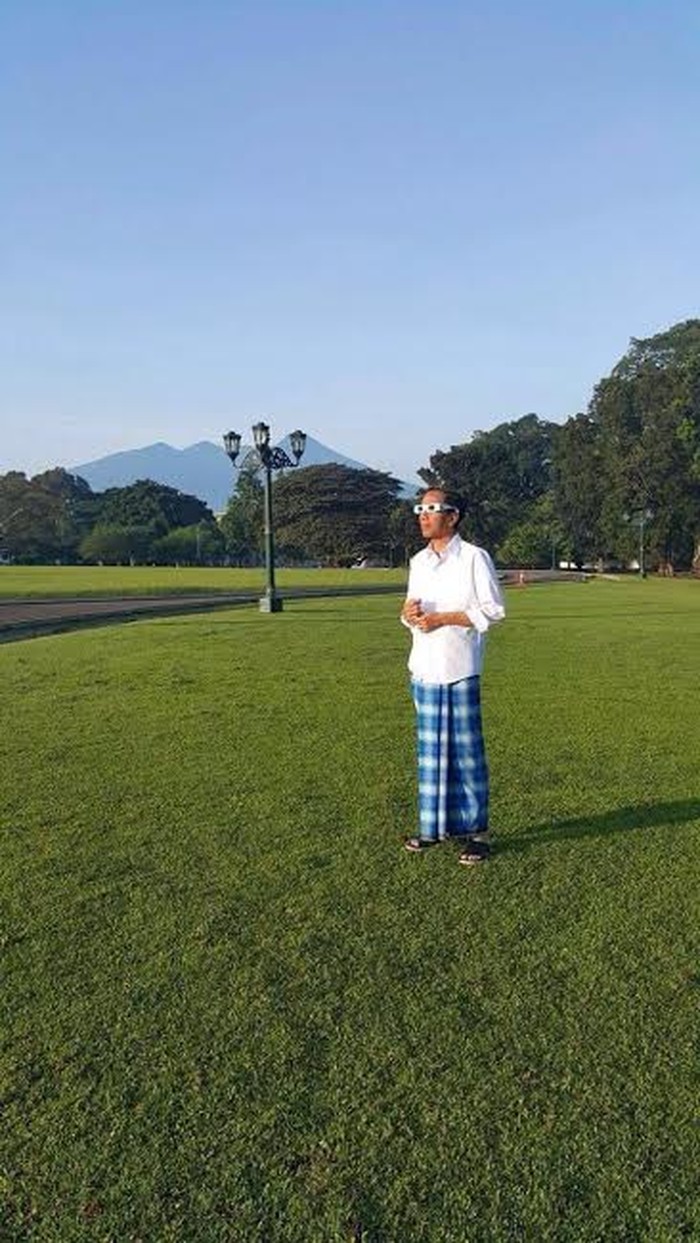 Dengan kemeja panjang lengan putih yang digulung, sarung, dan sebuah kacamata, Jokowi berdiri memandang ke matahari, Rabu (9/3/2016) pagi.