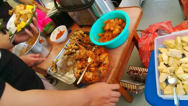 Ketika KN Gajah Laut merapat ke dermaga, menu makan siang sudah tersaji di meja kapal KN Kuda Laut. Ada sayur asem, ayam bumbu bali, ikan goreng, tahu goreng, sambal terasi dan krupuk.