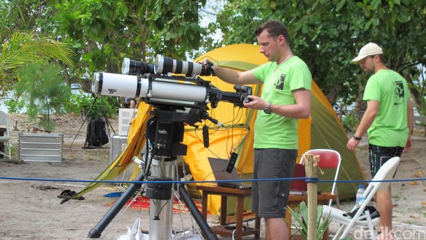 "Maaf, kita bisa ngobrol lagi setelah ini. Saat ini saya harus sangat fokus. Maaf sekali, nanti setelah gerhana kita bicara lagi. Tunggu sebentar," kata salah seorang anggota tim, sambil sibuk membidikkan lensa kamera ke arah matahari, dua jam sebelum gerhana berlangsung.