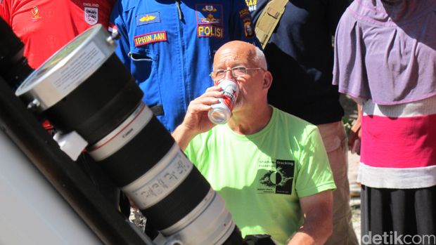 Untuk gerhana kali ini, jauh-jauh ia datang ke Maba, Halmahera Timur. Ia tidak menginap di hotel layaknya turis lainnya. Sejak dua hari sebelum gerhana, ia rela berpanas-panas mendirikan tenda di pelataran lantai 2 Kantor Bupati Maba, bersama rekannya sesama astrofotografer dari Ceko, Jans Sledecek, dan seorang mahasiswa astronomi dari University of Hawaii, Benjamin Boe.