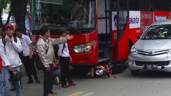 "Kejadiannya jam 11.56 WIB. Saya sampai di lokasi sudah begitu kondisinya, motor masuk ke kolong TransJ," kata Erwin, kontributor pasangmata.com saat dihubungi, Sabtu (12/3/2016).