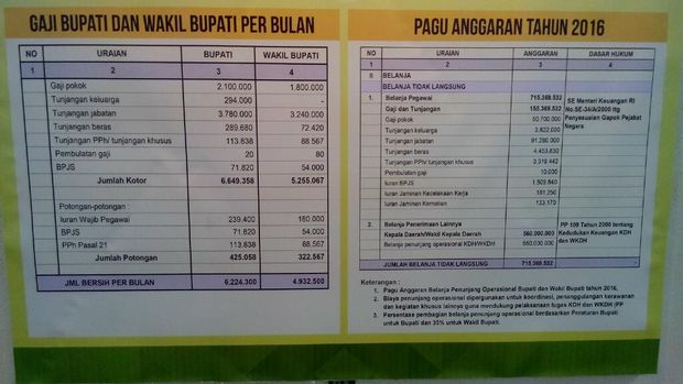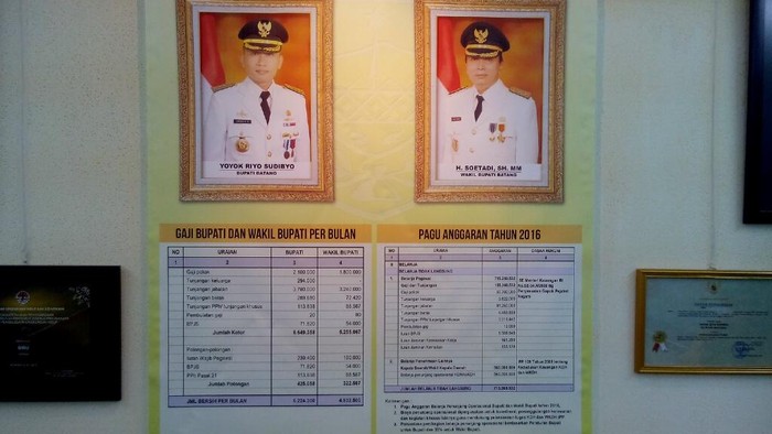 Di stand paling depan, dipajang gaji pasangan pemimpin Batang itu termasuk tunjangannya. Gaji Yoyok bila ditambahkan dengan tunjangan-tunjangan yaitu Rp 6.649.358. Namun jumlah tersebut dipotong oleh iuran wajib pegawai, BPJS, dan PPh Pasal 21 dengan jumlah Rp 425.058 sehingga gaji bersih yang diterima Yoyok sebulan adalah Rp 6.224.300.