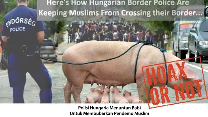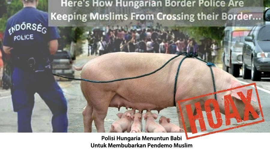 Sebuah foto provokatif beredar di media sosial. Isinya berupa gambar seorang polisi perbatasan Hungaria seolah-oleh sedang menuntun babi dan anak-anaknya di jalanan. Pose sang polisi digambarkan sedang menghalau demonstran yang disebut dari kalangan muslim.