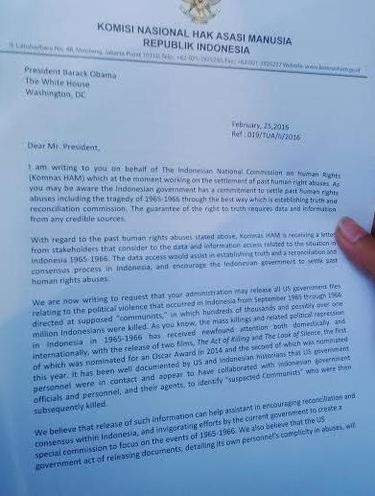 Nur Kholis mengungkapkan, surat itu dilayangkan Komnas HAM kepada Obama atas permintaan korban peristiwa 1965-1966. Dokumen itu dianggap cukup penting untuk menentukan kelanjutan pengusutan kasus pelanggaran HAM berat ini.
