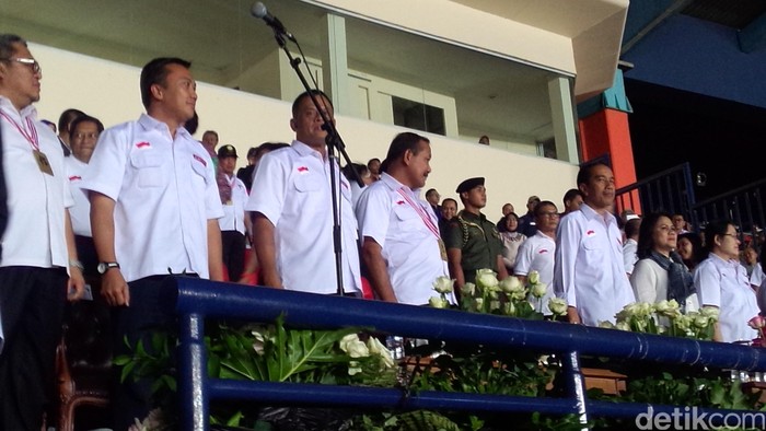 Di samping kanan Jokowi duduk Kapolri Jenderal Badrodin Haiti selaku penyelenggara, lalu ada Panglima TNI Jenderal Gatot Nurmantyo, Gubernur Jabar Ahmad Heryawan, dan Menpora Imam Nahrawi. Sementara itu di bangku belakang ada Wali Kota Bandung Ridwan Kamil dan Agum Gumelar.