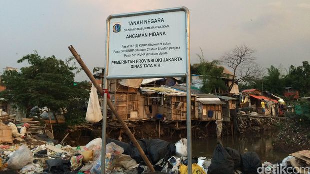 Ini sebagian sudah dibebasin sama pemda. Kalau yang masih ada rumah, itu masih tanah warga yang belum dibebasin. Dari pemda rencananya nanti mau dibuat waduk soalnya di sini sering banjir. Makanya nanti sedikit-sedikit dibebasin. Dulu di sini sawah, lalu diuruk, makanya sekarang ada bedeng yang berdiri di sini.