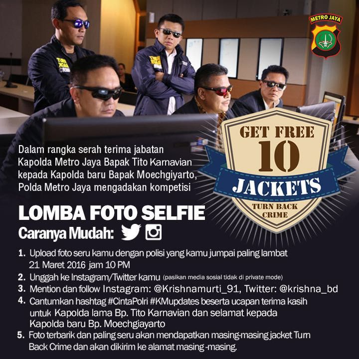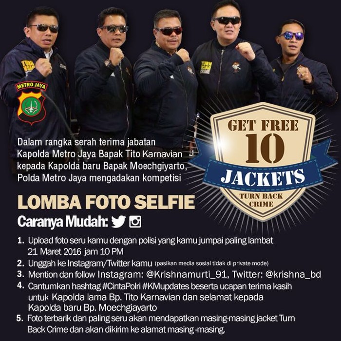 "Kompetisi ini dalam rangka pisah sambut dari Kapolda lama ke Kapolda baru. Silakan kirimkan foto-foto selfie anda dengan polisi ke akun media sosial kami," ujar Krishna, Minggu (20/3/2016).