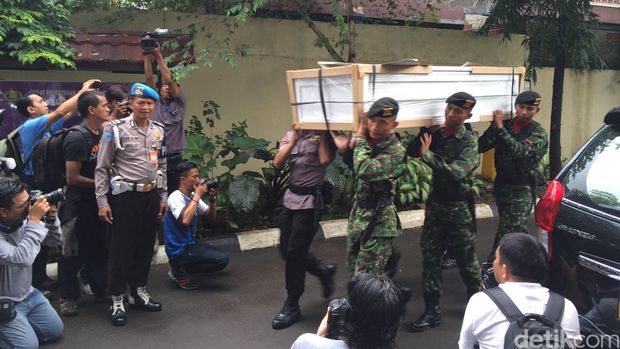 Pantauan detikcom, peti-peti itu tiba pada pukul 14.30 WIB, Senin (21/3/2016). Peti jenazah tersebut diangkat oleh sekitar 20-an personel Polisi. Para jurnalis tidak boleh mendekati ruang forensik dengan alasan sterilisasi tempat.