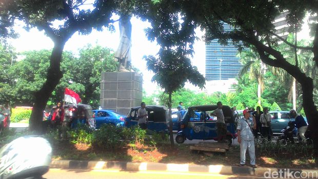 Jakarta - Aksi unjuk rasa pengemudi taksi di Jakarta hari ini, Selasa (22/3/2016) berlangsung rusuh di sejumlah titik. Di kawasan Tosari, Jakarta Pusat sejumlah pengemudi ojek pangkalan dan polisi menghentikan pengemudi Go-Jek dan menyarankan mereka untuk tidak melintas ke arah Semanggi.