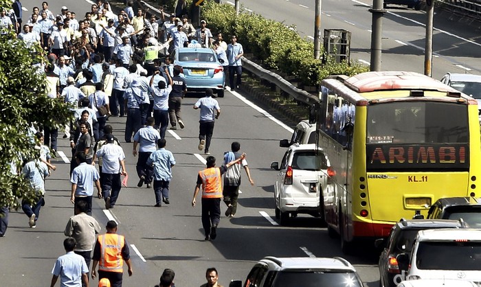Para sopir taksi pendemo ini masuk ke Jalan Tol Dalam Kota sekitar pukul 11.00 WIB, Selasa (22/3/2016). Ada puluhan sopir yang masuk ke jalan tol, namun mereka menyebar ke beberapa titik.