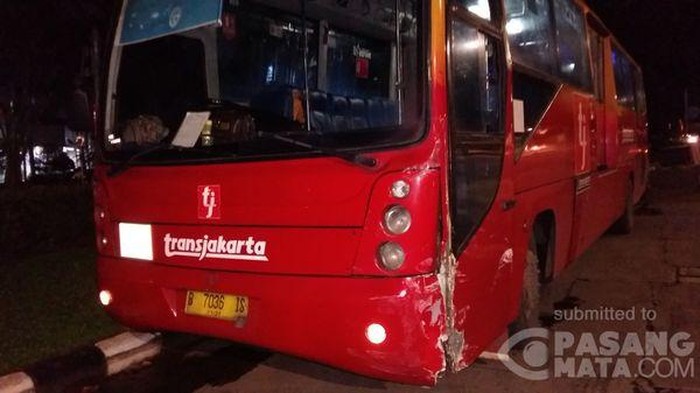 Bus TransJakarta Koridor I Blok M-Kota ditabrak Honda Stream di depan kantor Kementerian Perhubungan (Kemenhub). Akibatnya mobil itu pun ringsek di bagian pintu sopir.