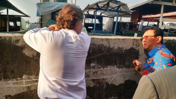 Ahok dan Koenders jalan-jalan di sore hari, di lokasi sekitar Waduk Pluit, Penjaringan, Jakarta Utara, Kamis (24/3/2016) sore. Setelah memarkir mobil, mereka berdua melihat rumah pompa di lokasi tersebut.