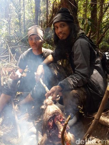 Dalam salah satu foto yang didapat detikcom, Santoso terlihat sedang memanggang kepala Anoa. Tubuhnya terlihat kurus dengan rambut dan jenggot panjang terurai.