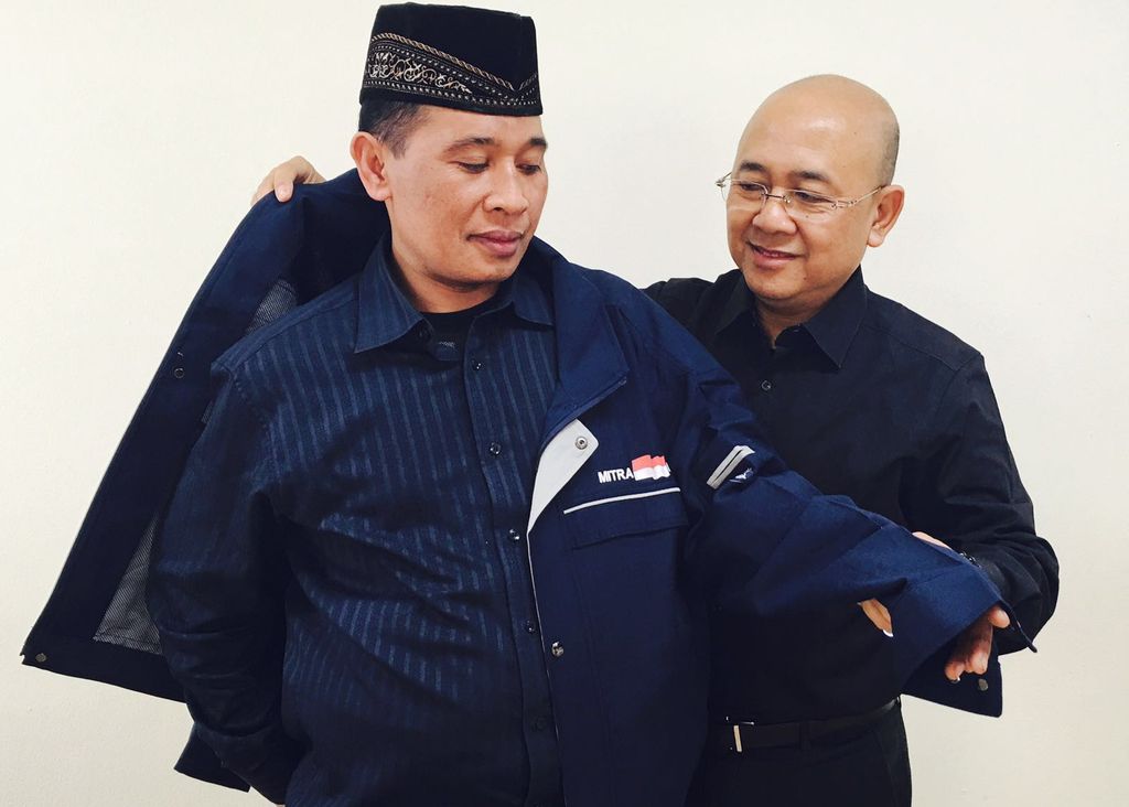 Minister Counsellor Bidang Konsuler KBRI Seoul, M Aji Surya, memasangkan jaket kepada anggota Mitra Indonesia (Foto: M Modin/detikcom) |