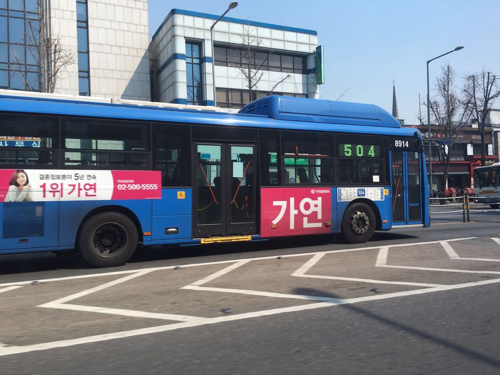 Sekarang soal bus kota. Di Seoul jumlah bus kota sangatlah banyaknya. Dari dan ke jurusan manapun. Semua ada. Busnya pun mirip-mirip milik Trans Jakarta. Hanya, untuk naiknya tidak perlu di shelter khusus. Cukup menunggu di tempat pemberhentian bus.