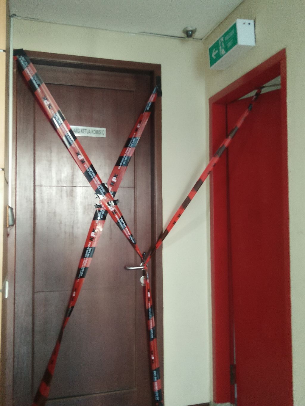 Sebagaimana terlihat di lokasi Ruang Ketua Komisi D, Lantai 1, Gedung DPRD DKI lama, Jl Kebon Sirih, Jakarta Pusat, Jumat (1/4/2016), pintu Ruangan dalam kondisi tertutup, garis batas KPK berwarna merah-hitam melintang berbentuk huruf 'X'.