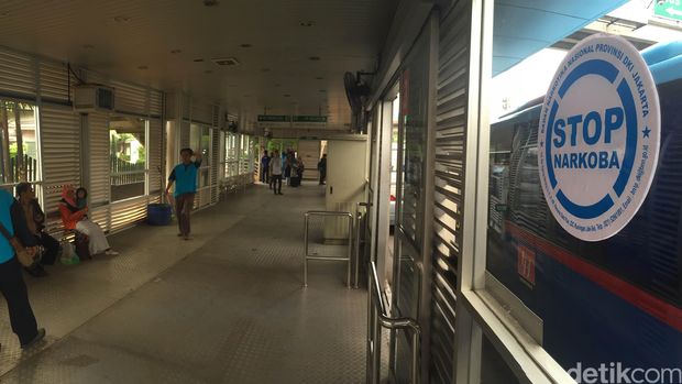 Tak hanya di bus, pemasangan stiker juga di lakukan di seluruh halte Transjakarta. Halte yang pertama dipasangi stiker yakni halte BNN yang berada di Jl MT Haryono, Cawang, Jakarta Timur.