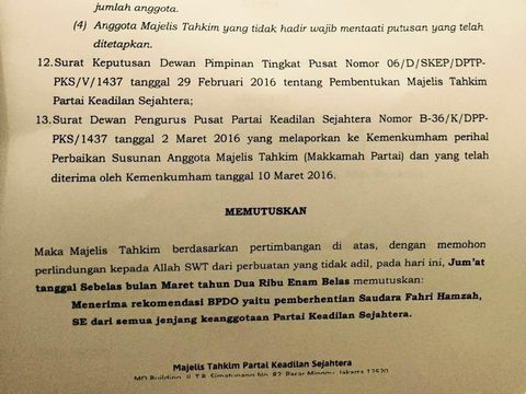 "Maka Majelis Tahkim berdasarkan pertimbangan di atas, dengan memohon perlindungan kepada Allah SWT dari perbuatan yang tidak adil, pada hari ini, Jumat tanggal sebelas bulan Maret tahun dua ribu enam belas memutuskan: Menerima rekomendasi BPDO yaitu pemberhentian Saudara Fahri Hamzah, SE dari semua jenjang keanggotaan Partai Keadian Sejahtera."